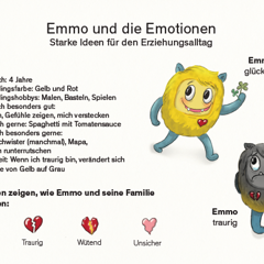Gemeinsam mit Emmo und seiner Familie entdecken Kinder und Eltern die Emotionen, welchen sie im Familienalltag häufig begegnen. Sie lernen, zu verstehen, dass alle Emotionen wichtig sind. Am Ende jeder Situation erhalten Eltern einige starke Ideen für den Erziehungsalltag. Denn alle Emotionen sind erlaubt, aber nicht alle Handlungen.