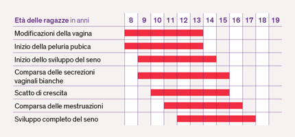 Ben presto emergono segni visibili: nelle bambine, lo sviluppo del seno inizia tra gli 8 e i 13 anni. La prima mestruazione segue di solito due anni dopo. Nei ragazzi, i testicoli cominciano a ingrandirsi, solitamente tra i 9 e i 14 anni. È solo verso la fine di questo processo di maturazione che la voce cambia: è la cosiddetta muta vocale.